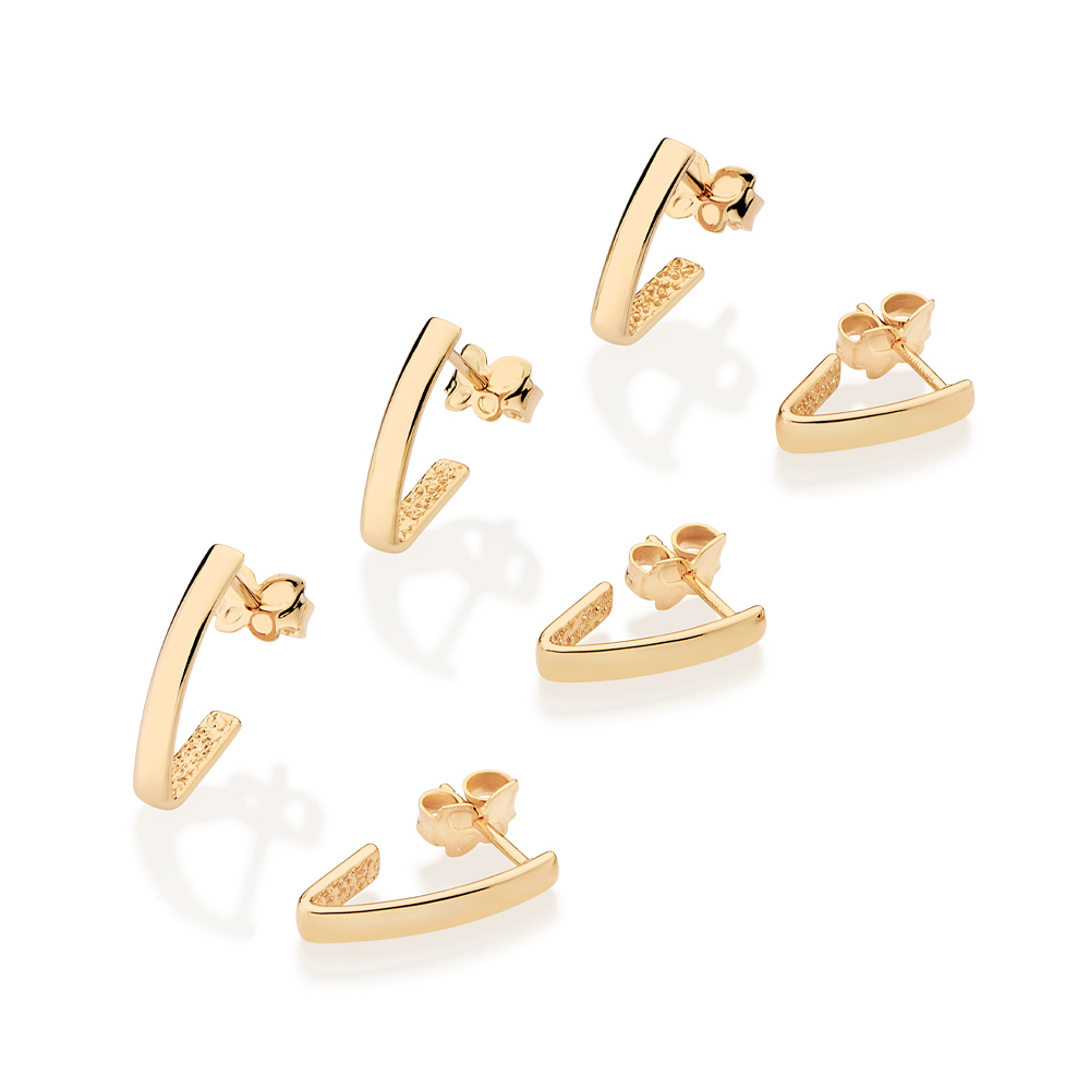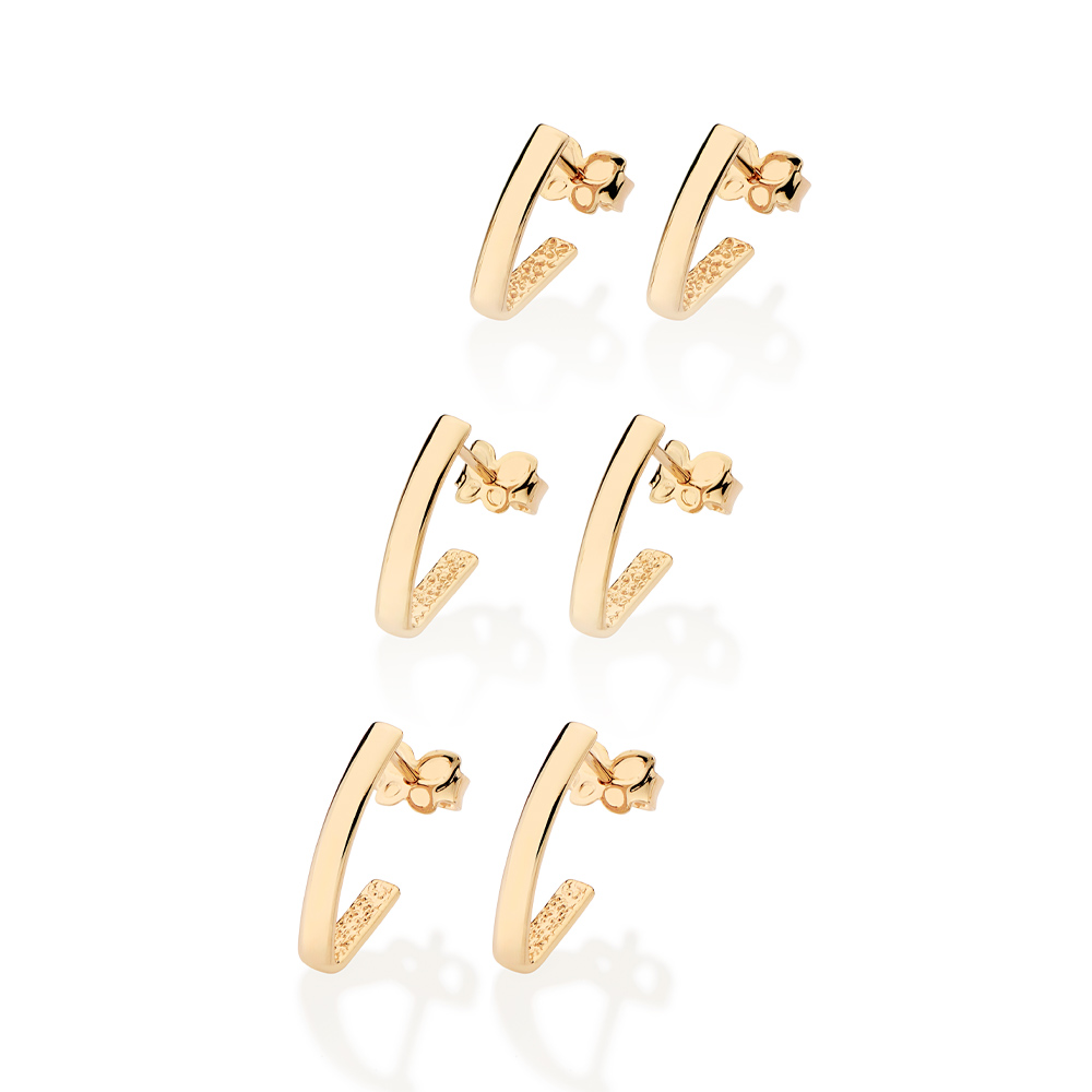 Kit brinco meia argola formato v com 1 par de 1,60 cm x 0,30 cm, 1 par de 1,50 cm x 0,30 cm e 1 par de 1,40 cm x 0,30 cm. med. 1,60 cm x 0,30 cm /1,50 cm x 0,30 cm / 1,40 cm x 0,30 cm