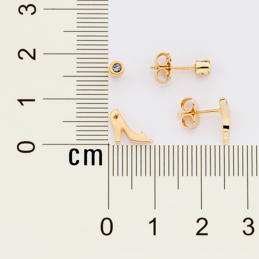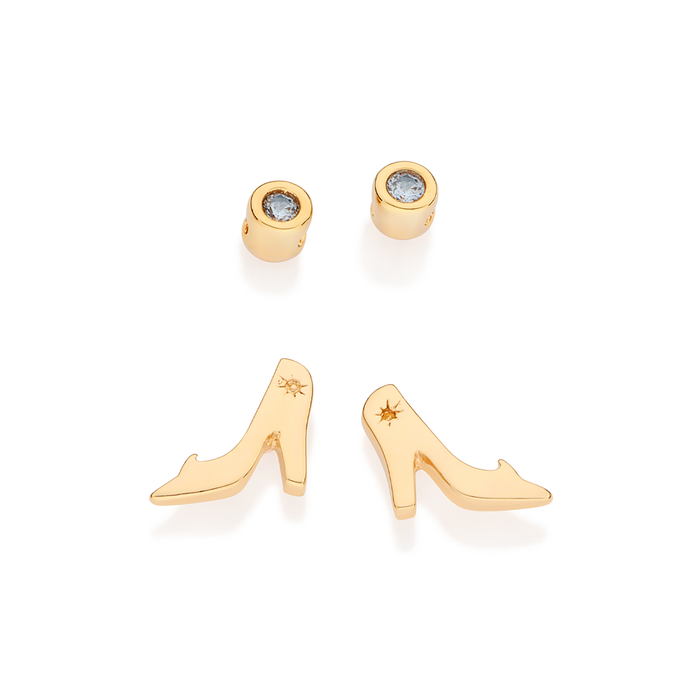 Kit brinco formado por um par solitário composto por 2 zircônias de 2,00mm e um par formato sapato cinderela. med. 1,10 cm x 0,80 cm / 0,80 cm x 0,80 cm (joia licenciada coleção disney)