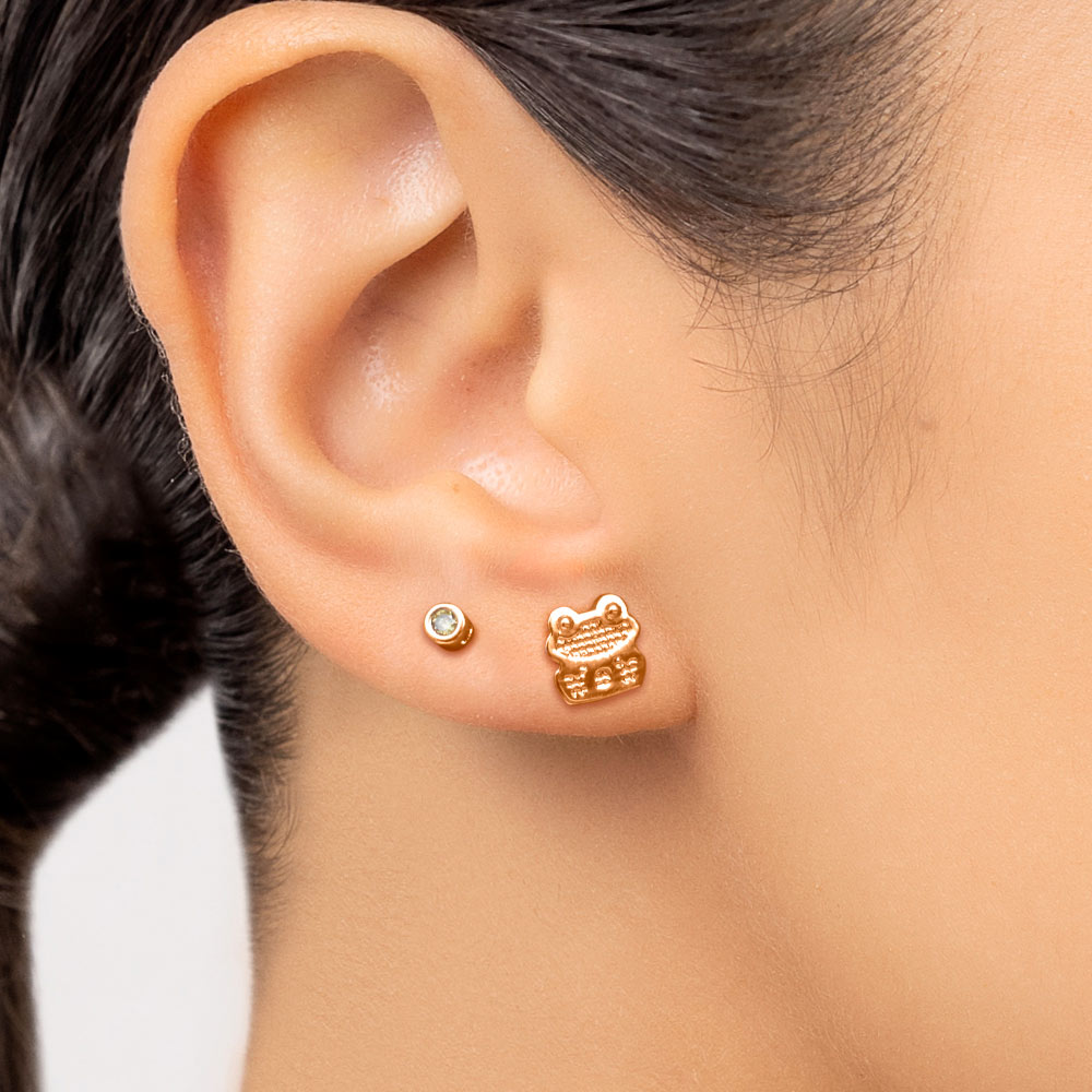 Kit brinco formado por um par solitário composto por duas zircônias de 2,00 mm e um par formato sapo. med. 0,70 cm x 0,80 cm / 0,30 cm x 0,30 cm (joia licenciada coleção disney)