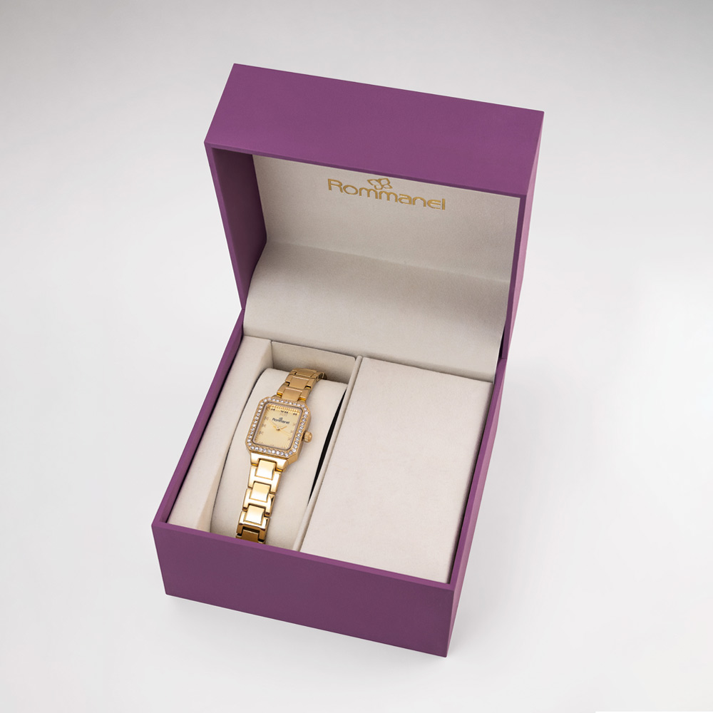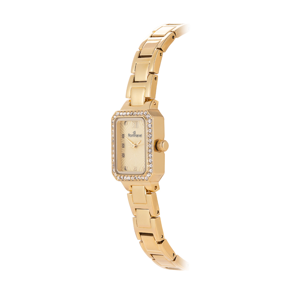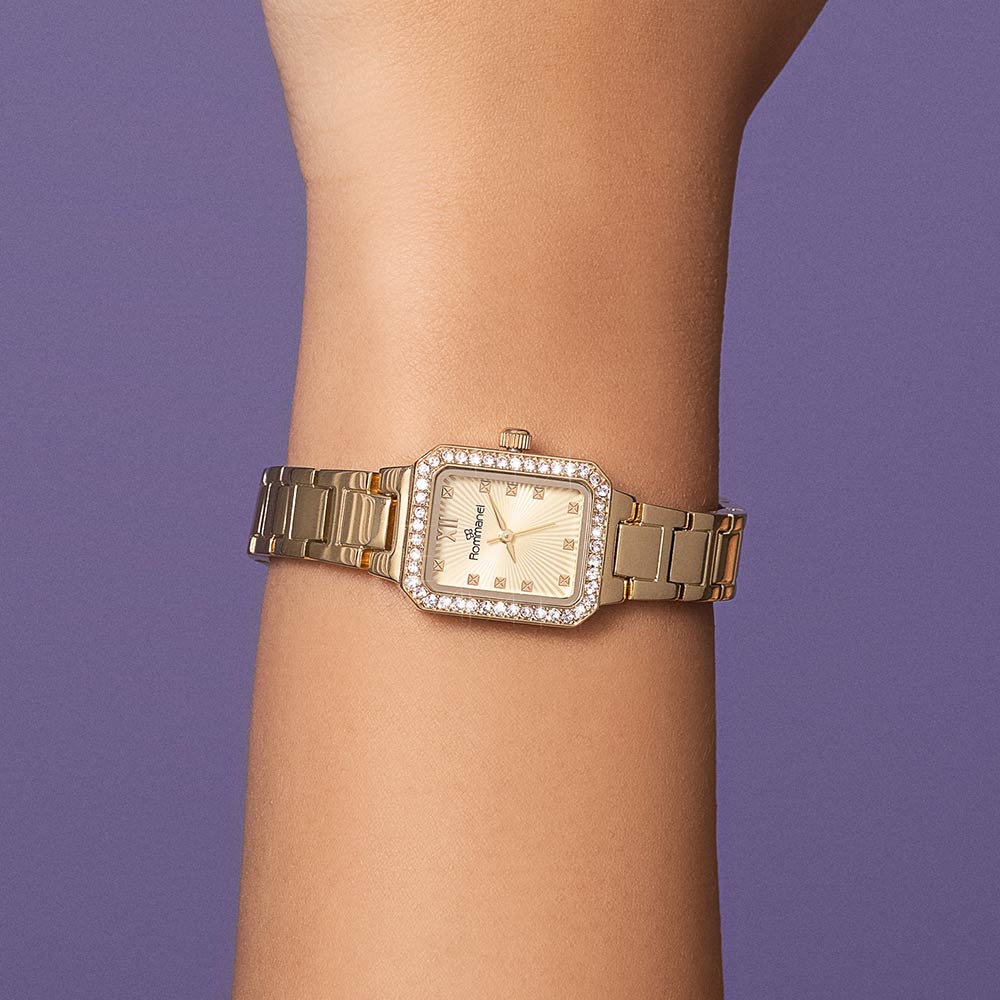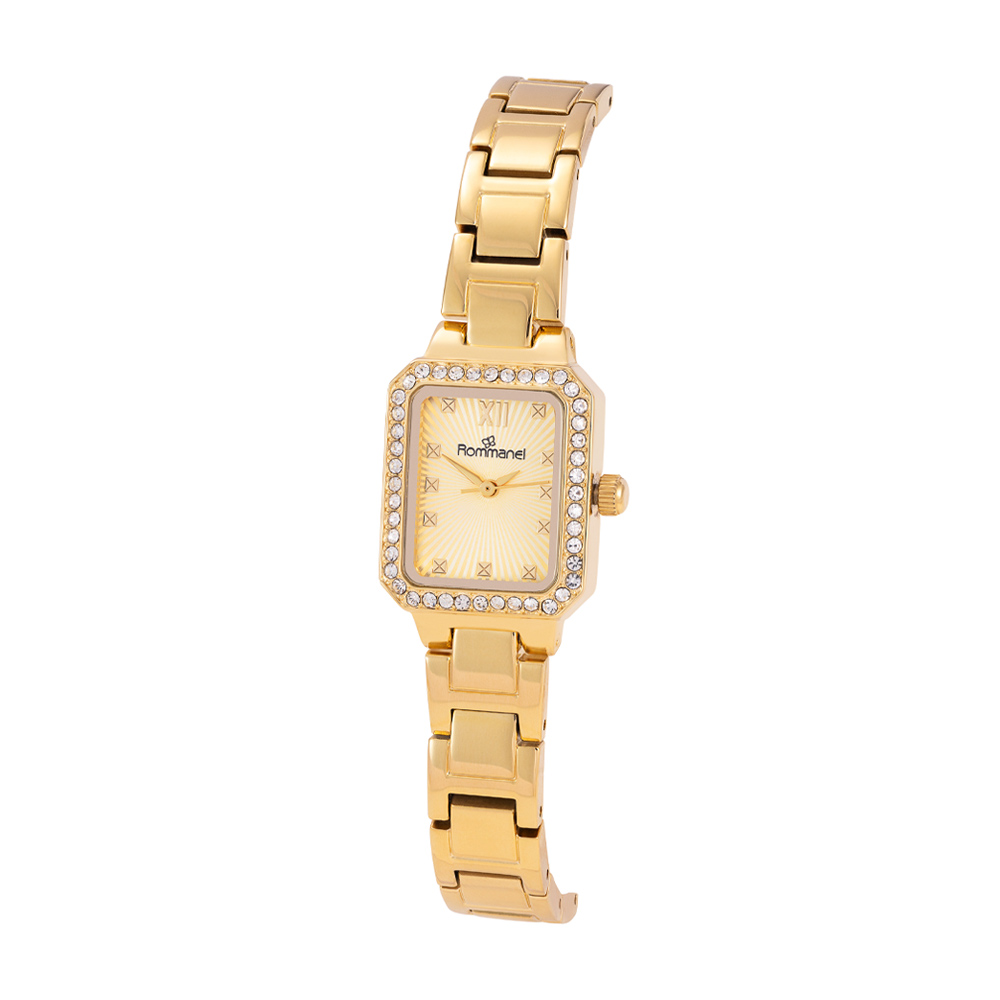 Relógio análogico social dourado com cristais 650043 Rommanel Relógio analógico social na cor dourado, caixa retangular de metal com 44 cristais, mostrador dourado, números e ponteiros dourados, vidro mineral, pulseira de aço dourada com fecho de pressão.
