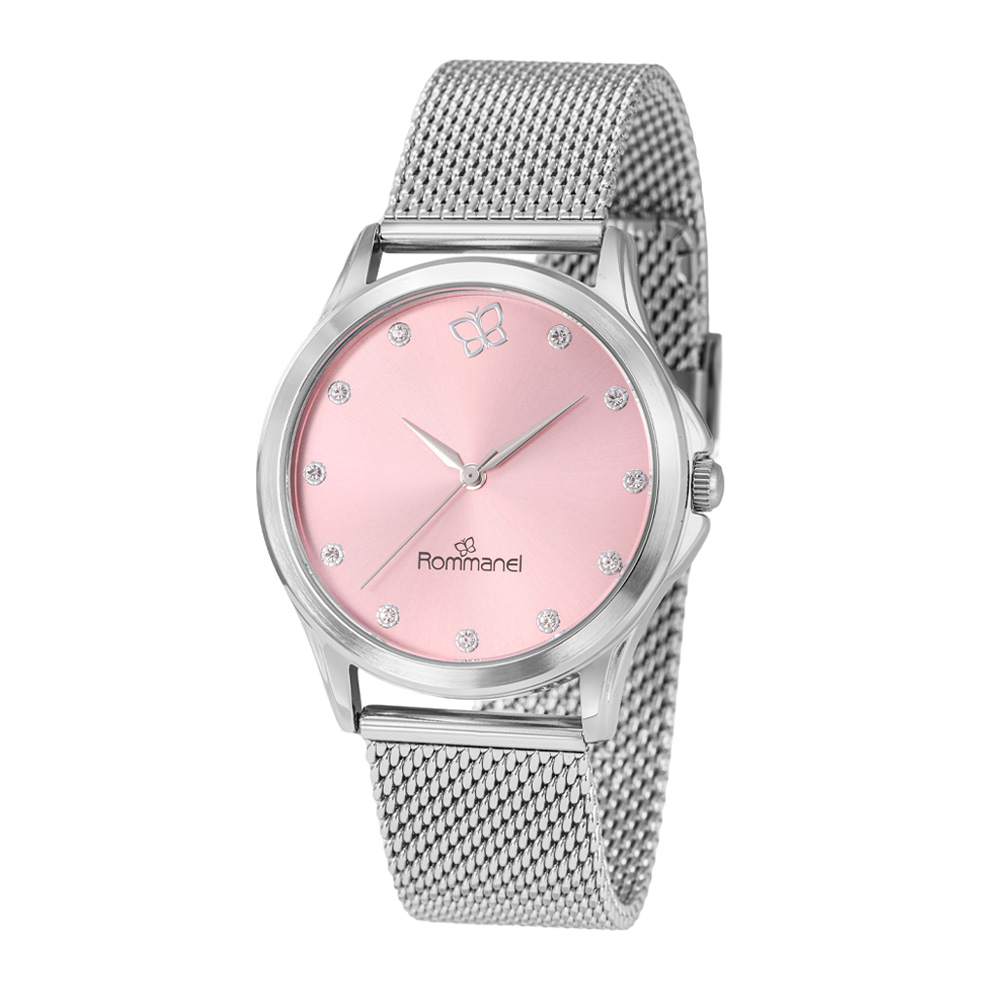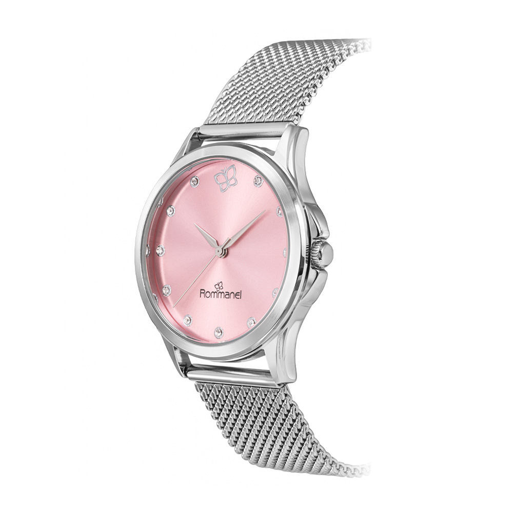 Relógio analógico social prata, caixa redonda de metal, mostrador rosa com 11 cristais e 1 borboleta, ponteiros cinza, vidro mineral, pulseira de aço, fecho slide com trava de pressão, resistente a água em até 50 m. med. relógio:23 cm (ajustável no pulso) med. da caixa: 38mm x 38mm x 9mm